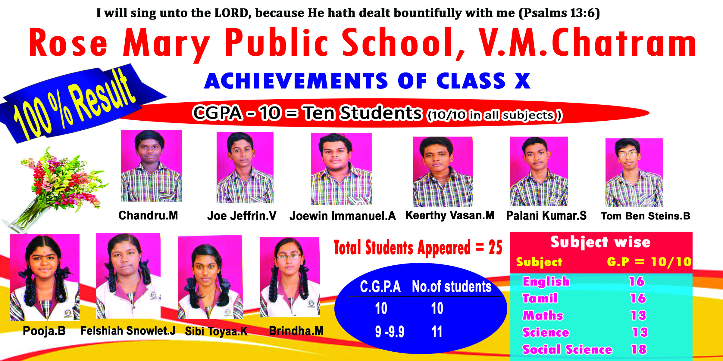 Our school class X has attained 100% result. C.G.P.A - 10 = Ten students (10/10 in all subjects) C.G.P.A - 9 - 9.9 = Eleven students Congratulations on your achievements!